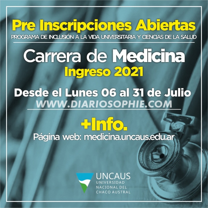 Desde hoy, y hasta el próximo 31 de julio, la Universidad Nacional del Chaco Austral, habilitó las preinscripciones para el Programa de Inclusión a la Vida Universitaria y Ciencias de la Salud (P.I.V.U.C.S.), destinado a aquellas personas que deseen estudiar la carrera de Medicina en la Institución, con ingreso 2020-2021.