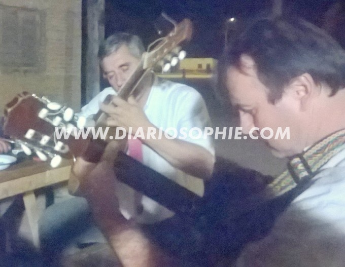 Integrantes del Dúo Avalos Lencina luego de una actuación en un festival local deleitaron con su música a un grupo de obreros.