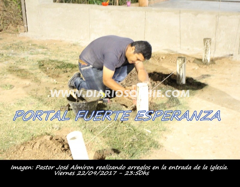 24/09/2017// El día viernes por la noche, casi cerca de las 0 (cero) horas, cuando el pueblo de Fuerte Esperanza se encontraba en vísperas de un aniversario más de su fundación en las instalaciones del Polideportivo “Gonzalo Galo”, el equipo de Portal Fuerte Esperanza se topa con la imagen del Pastor José Almirón en pleno labor de albañil, lo cual la postal era plasmada casi de inmediato por nuestras cámaras, donde se refleja el labor de los pastores fuertenses.