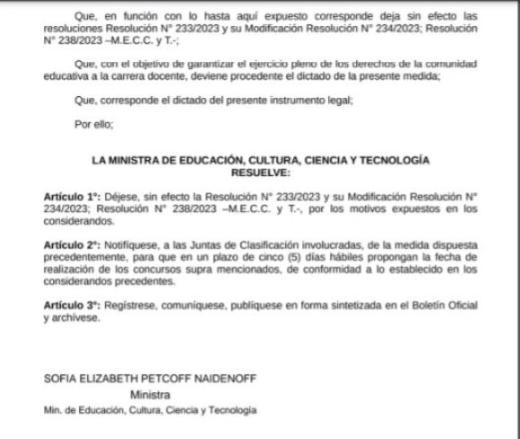 Tal como se había anunciado la semana pasada, el Ministerio de Educación, Cultura, Ciencia y Tecnología de la Provincia, través de la Resolución N° 3174/2024, firmada por la ministra Sofía Naidenoff, ha dejado sin efecto las resoluciones por las cuales se había ordenado la reprogramación de los concursos docentes (resoluciones N° 233, 234 y 238 de 2023) durante la gestión anterior, como consecuencia de medidas cautelares presentadas por un grupo de postulantes y vinculadas a postítulos apócrifos.