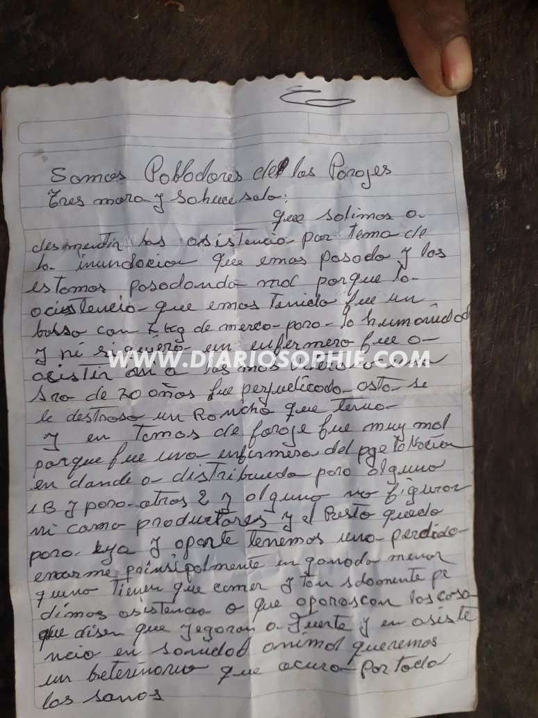 Salimos a desmentir a desmentir de las asistencias por tema de inundaciones que hemos pasado y las estamos pasando mal porque la asistencia que hemos tenido fue un bolso con 7 kg de mercadería para la humanidad y ni si quiera un enfermero fue a asistir hacia los más veteranos una señora de 70 años fue perjudicada hasta se le destrozó un rancho que tenía y en temas de paraje fue muy mal porque fue una enfermera del paraje la nación en donde a distribuido para alguno 1 bolsa y para otros 2 y algunos no figuran ni como productores y el resto quedo para ella y aparte tenemos una enorme pérdida principalmente en ganado menor que no tienen que comer y tan solamente pedimos asistencia o que aparezcan las cosas que dicen que llegaron y asistencia en Salud animal queremos un veterinario que acuda por todas las zonas".