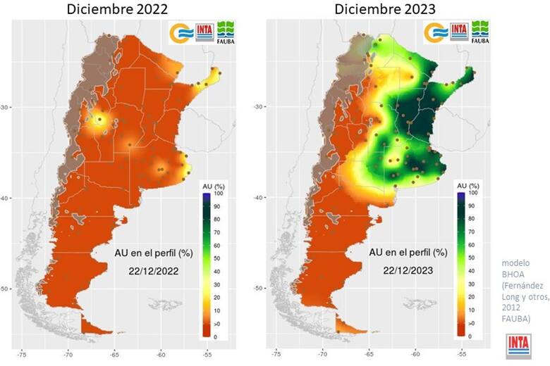 La notable mejora en las proyecciones de la producción es consecuencia de la llegada de las lluvias a las principales regiones agrícolas. En diálogo con LA NACION, Natalia Gattinoni, investigadora del área de Agrometeorología del Instituto de Clima y Agua del INTA, comparó mapas que ilustran la disponibilidad de agua en el suelo en las zonas agrícolas con el año pasado.