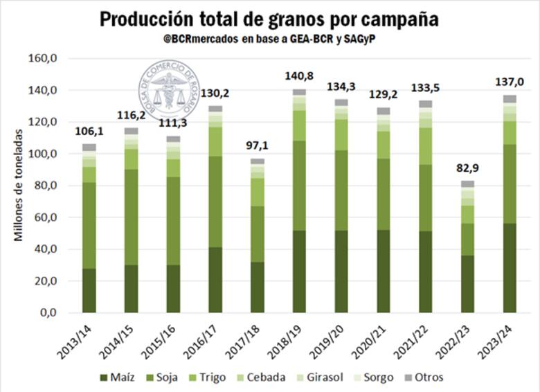 Según la Bolsa de Comercio de Rosario (BCR), la producción 2023/2024 se ubicará en 137 millones de toneladas en medio de la recuperación climática; en valor habrá exportaciones agrícolas por US$35.800 millones.