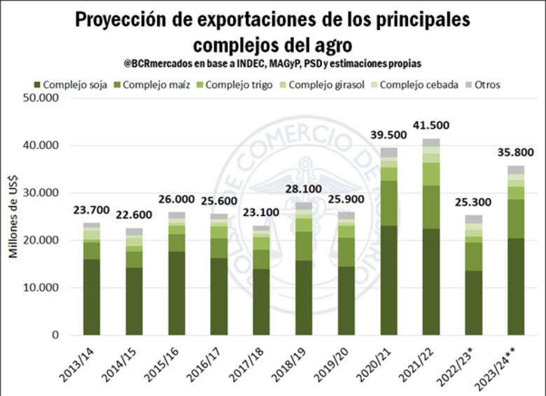 “De esta manera, la exportación de granos y subproductos del agro representaría cerca del 45% del total de los US$75.000 millones proyectados a exportar en total desde el país para el próximo año 2024″, subrayó la BCR.