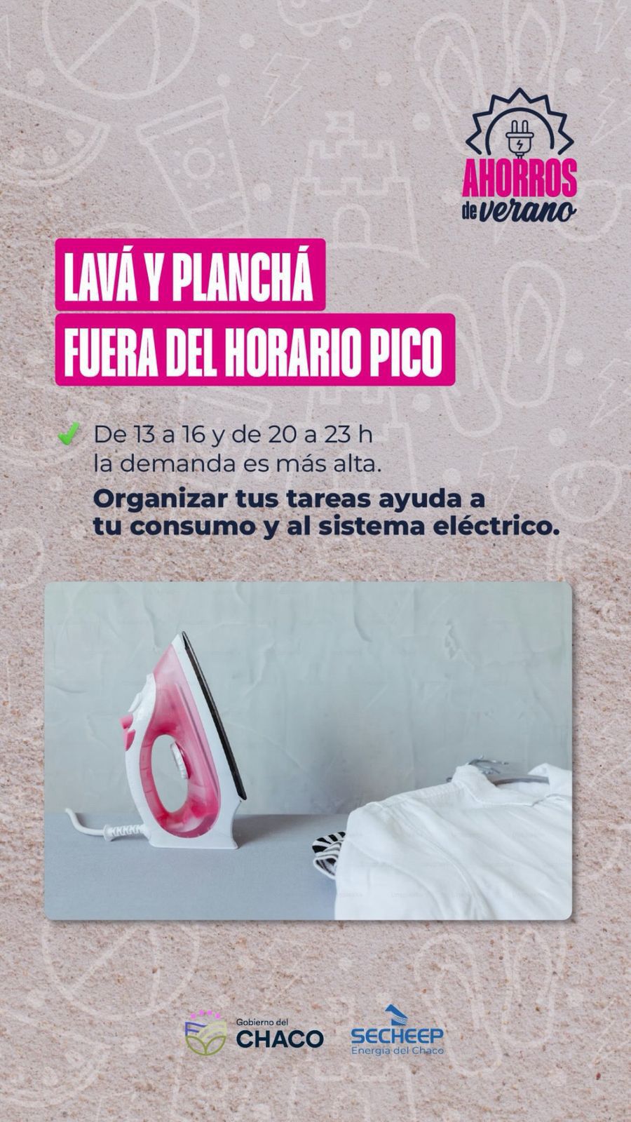 -Planchar y lavar en horarios de menor demanda: Programar estas tareas fuera de los picos de consumo (de 13 a 16 y de 20 a 23) puede generar un impacto positivo. Se recomienda realizarlas temprano por la mañana o después del atardecer. Cambiar los horarios no implica consumir menos energía, pero sí contribuye a reducir los picos de demanda.